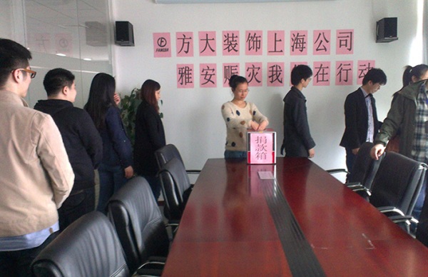 4月20日8时02分,四川省雅安市芦山县发生7.0级地震,人民生命财产遭受重大损失。一方有难,八方支援。在雅安人民在遭受灾难的时候,方大集团在第一时间号召集团全体员工为灾区捐款,支持雅安人民抗震救灾。集团总部和分布在北京、上海、成都、沈阳、南昌、东莞等全国各地的方大集团员工纷纷捐款,以实际行动献爱心。据不完全统计,截至4月23日,方大集团已经向雅安地震灾区捐款已达257462元,以帮助灾区人民重建家园,与灾区人民一起共渡危难。这也是继向汶川、玉树地震灾区捐款后,方大集团再一次向震区人民伸出援手,是方大集团“报国报民报一方”大爱精神的再次彰显。