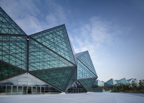 深圳大运中心体育馆钢结构屋盖集高耸结构和大跨度空间结构于一体,由16个形状相近的钢结构单元构成,直径达158米,工程用钢量约5800吨。项目外围护结构系统(屋面结构系统与立面幕墙系统)总面积3.3万平方米,由三角形钢架、聚碳酸酯板和钢化夹胶玻璃共同组成“水晶石”造型,内层采用玻璃纤维张拉膜。其中屋面结构系统由224根三角形钢架做骨架、7776块9393平方米的聚碳酸酯板(PC板)、10358块17471平方米的XIR膜夹胶钢化玻璃、6439平方米的“W”形铝板天沟和624个自然通风及48个机械通风百叶组成。立面幕墙系统由144根钢立柱组成受力支撑骨架,由2727平方米的中空LOW-E钢化玻璃和64档平开门组成。