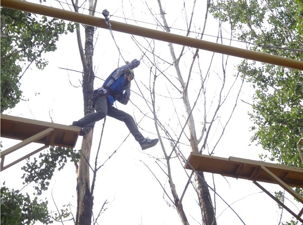 接着,两个小组分别进行了“信任背摔”、“七巧板”、“高空断桥”等科目培训,以建立团队成员间的相互信任,有效沟通与自我突破。“寻找刘连长”活动在影视城穿越中进行,两个小队按照教练给定的“动感颠球”、“穿越A4纸”、“飞龙升天”、“眉目传情”、“百兽秘影”5个图片的先后顺序找到相应的点,通过大家的集思广益相互协作和有效沟通完成,最终在规定时间内找到刘连长。通过这个训练科目,大家明白了个人是整体的一部分,在听从指挥的情况下,还要发挥各自的特长,把优质资源整合在一起,才能发挥更大的作用,产生更大的效能,实现最终目标。