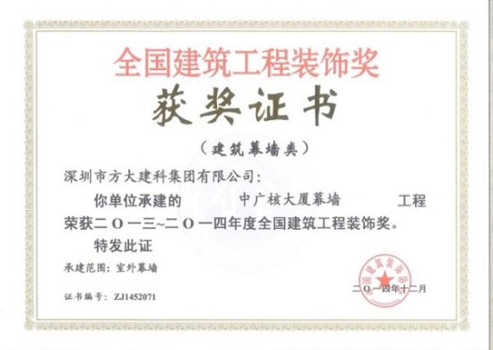 “2013-2014年度全国建筑工程装饰奖”获奖结果在北京揭晓,深圳市方大建科集团有限公司荣获四项建筑幕墙类大奖,获奖项目分别为:中铁南方总部大厦幕墙工程、大连万达公馆1#楼幕墙工程、嘉里建设广场二期幕墙工程、中广核大厦幕墙工程。