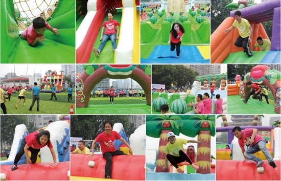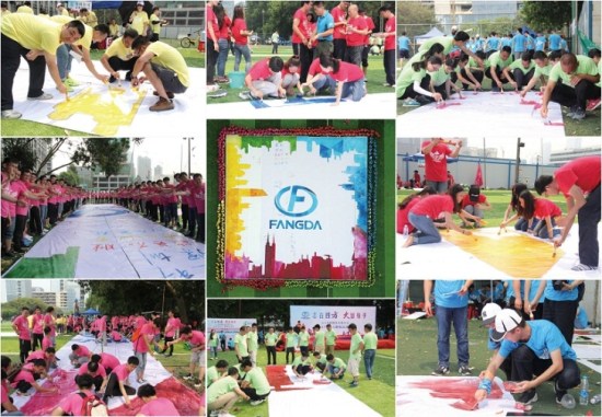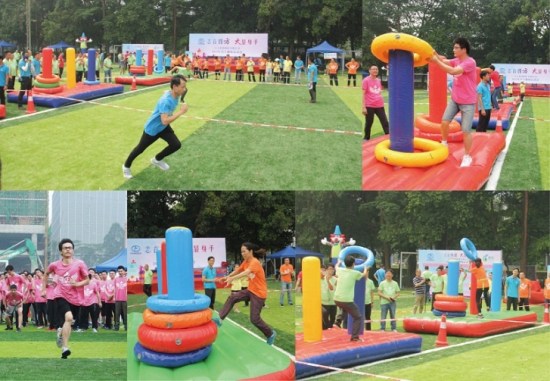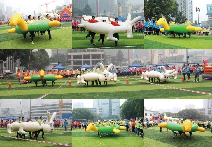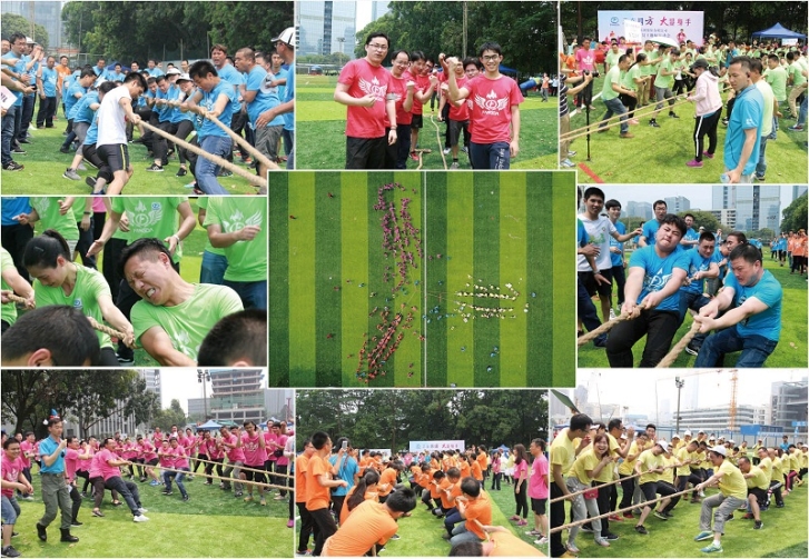 本次运动会设置了龟兔赛跑、超级汉诺塔、快乐gogogo、趣味拔河、纳斯卡巨画等趣味项目,比赛场上处处充满着欢声笑语,大家玩得不亦乐乎!在龟兔赛跑环节,各代表队的队员们分别顶着巨型充气“乌龟”、“兔子”笑着跑着,奋力竞争,争取最好的比赛成绩;在超级汉诺塔环节,考验的不仅有团队成员的运动能力,还有团队内部的组织协作效率;在快乐gogogo环节,更是掀起了所有参赛员工的火热激情,他们在气垫城堡中穿梭、攀爬、滑行、滚动,在回味和体验孩童时代乐趣的同时,为自己的团队争取好的名次;趣味拔河环节是这次运动会的最高潮,只见加油的叫喊声震天动地,拔河的队员无不神态激越,使出浑身之力,将拔河绳拉得吱吱地响;最后是纳斯卡巨画环节,参与运动会的全体员工一同用五颜六色的油彩,分工合作,共同绘出印有方大集团logo的巨型图画。通过百米高空上无人机的航拍我们看到,在530余名方大人簇拥中的方大logo巨画,在灿烂阳光的照耀下,正闪闪发光,正如她在行业中的响亮知名度一样。