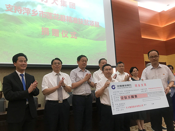 7月25日,方大集团向江西省萍乡市莲花县捐款100万元用于精准扶贫项目建设。