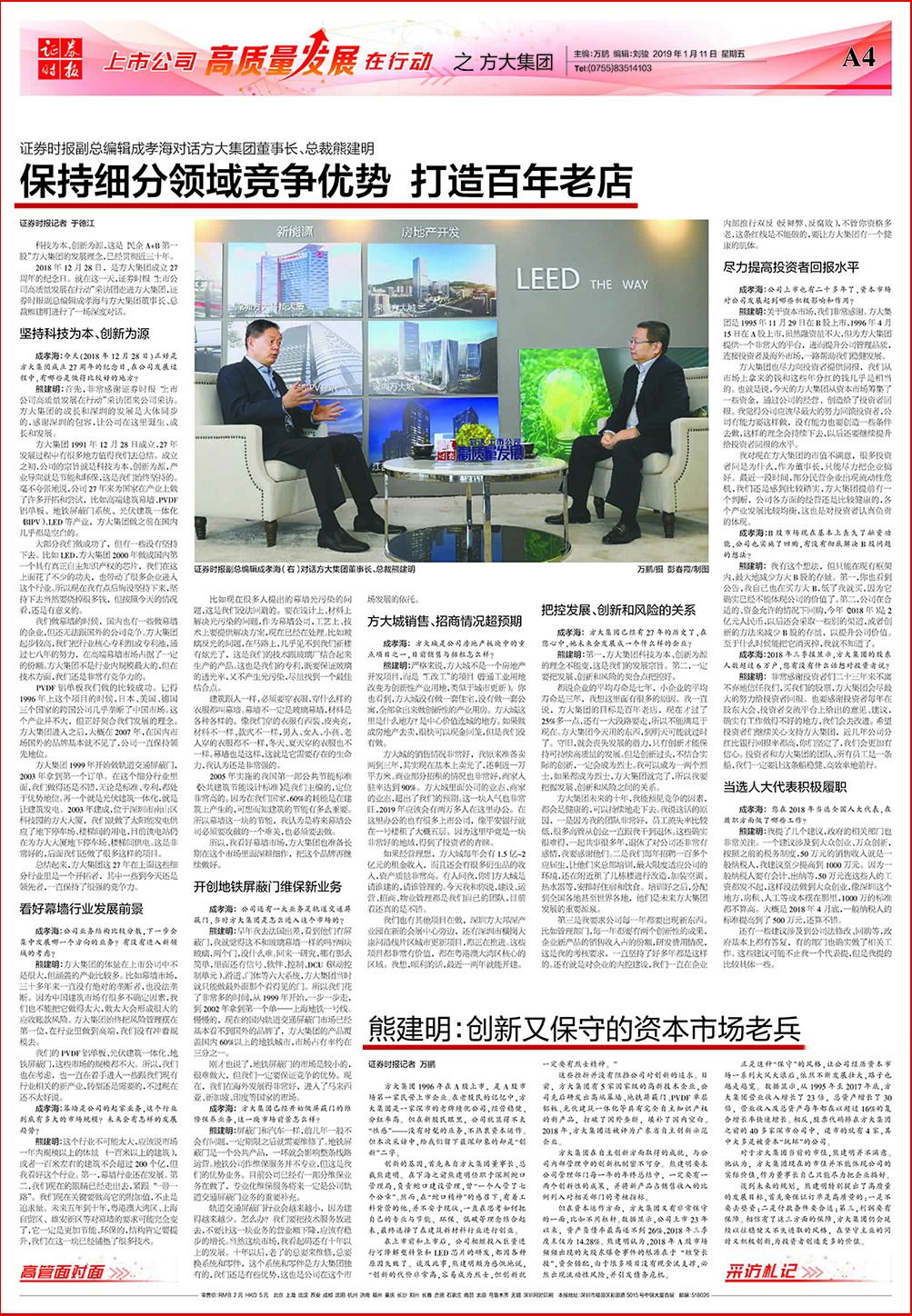 熊建明:首先,非常感谢证券时报“上市公司高质量发展在行动”采访团来公司采访。方大集团的成长和深圳的发展是大体同步的,感谢深圳的包容,让公司在这里诞生、成长和发展。