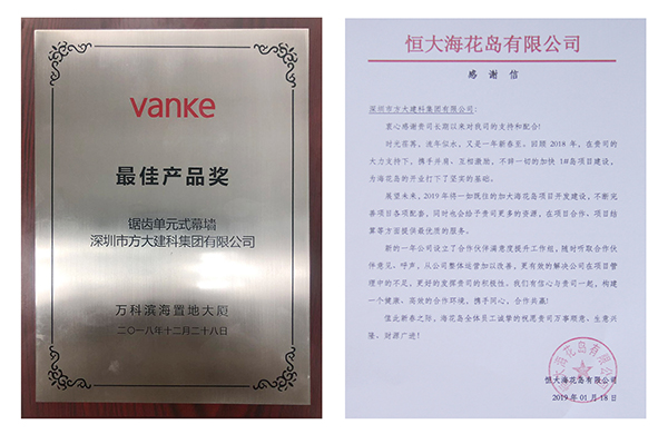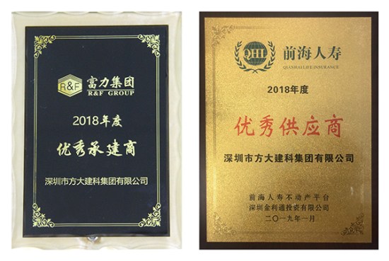 富力集团授予方大建科“2018年度优秀承建商”、前海人寿授予方大建科“2018年度优秀供应商”、 万科授予方大建科“最佳产品奖”、恒大海花岛给方大建科一封感谢信。年末获得的各大地产商授予的荣誉,涵盖产品质量、工程交期、客户服务等多个方面,是业主对方大建科在2018年经营管理及公司综合实力的充分认可。