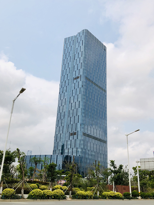 深圳·金利通金融中心位于深圳市宝安区,建筑高度211m,幕墙类型主要是单元式玻璃幕墙、石材幕墙、铝板幕墙。建筑外立面端庄大气,每个立面从底部至顶部斜向分布了400mm×390mm的铝板装饰柱,裙楼采用25mm厚花岗岩、铝合金挂件系统,面板错缝设计,搭配横向通长玻璃条窗及石材凹槽造型,整个立面显得错落有致。项目团队及时解决合作中碰到的问题,克服了工期紧、任务重、质量高等种种困难后,打造出一个集写字楼、城市公馆、裙楼商业为一体的“前海花园式集约化高端商务综合体”。