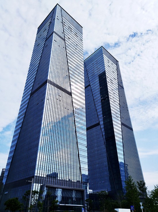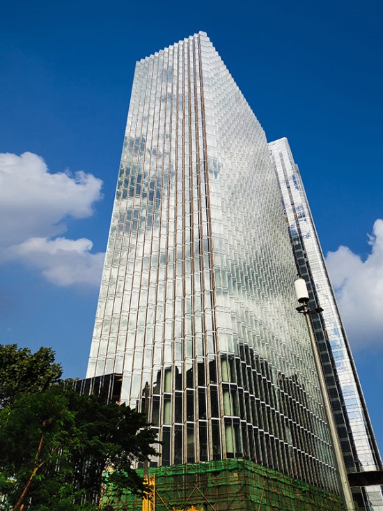深圳·万科滨海置地大厦位于深圳市福田区,幕墙类型主要是锯齿状单元式玻璃+石材+穿孔铝板幕墙。项目塔楼采用L型和I型单元板块组成,面板采用蜂窝石材、中空夹胶玻璃和穿孔铝板。为了增强幕墙系统的通风性能,在穿孔铝板后侧设置了内开的铝板窗。锯齿状的幕墙类型和特色材料的组合使该项目成为滨河大道上的一道靓丽风景,同时也给设计施工带来了难题,项目团队通过三维模拟确保L型板块与I型板块精确插接,对使用高度157m的蜂窝石材连接方案进行了加强措施,并顺利通过幕墙专家专项的评审。