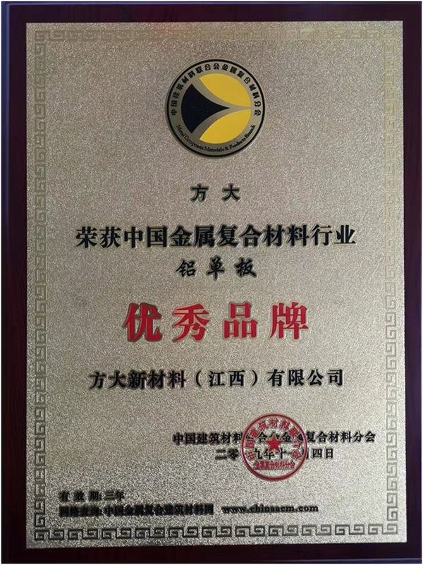 近日,由中国建筑学会、慕尼黑博览集团、中联慕尼(北京)国际会展有限公司联合主办的2019金属复合材料行业年会暨第五届行业创新发展论坛在上海松江盛大举行。会议对行业发展作出突出贡献的企业进行了表彰,方大集团全资子公司方大新材料(江西)有限公司凭借过硬的产品质量荣获中国金属复合材料行业铝单板“优秀品牌”称号。