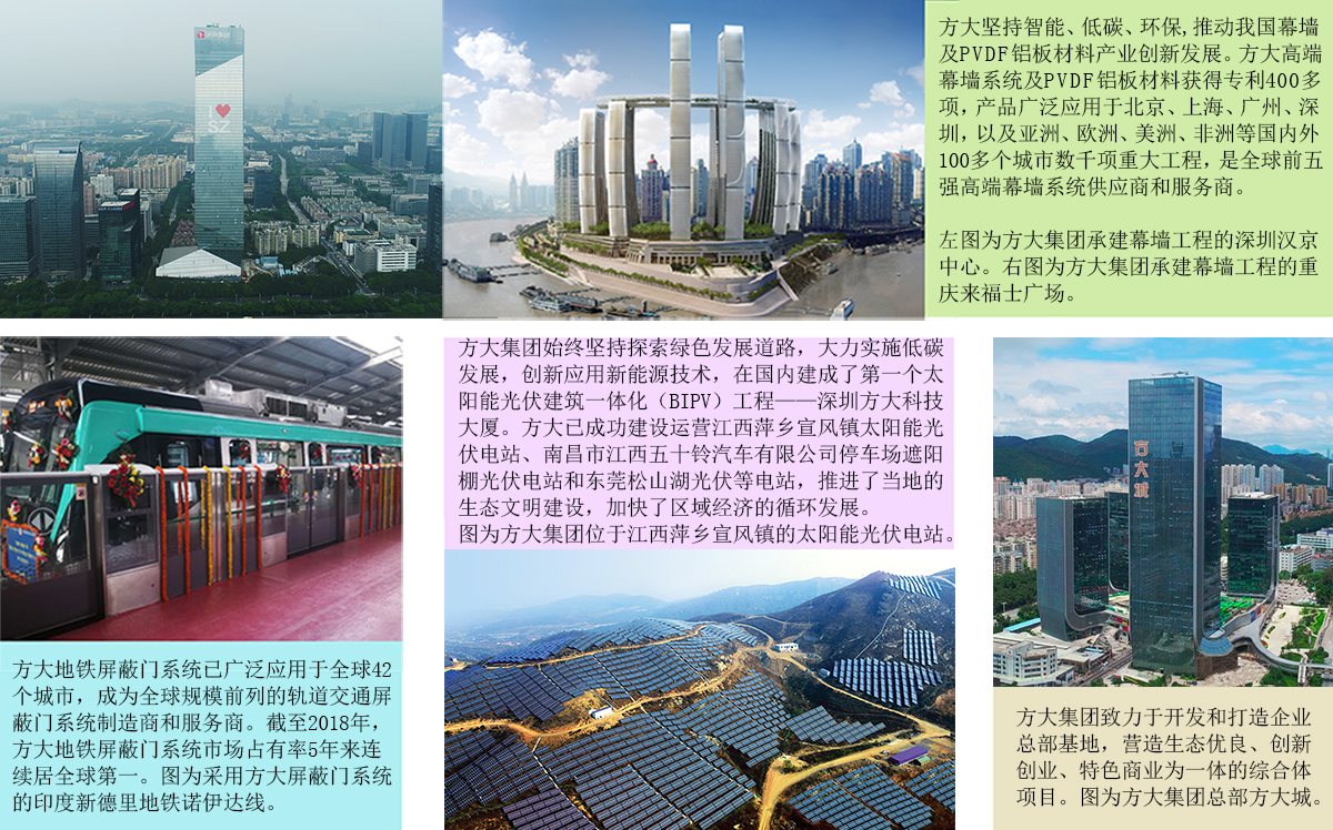 24年来,方大坚持智能、低碳、环保,推动我国幕墙及PVDF铝板材料产业创新发展。方大高端幕墙系统及PVDF铝板材料获得专利400多项,产品广泛应用于北京、上海、广州、深圳,以及亚洲、欧洲、美洲、非洲等国内外100多个城市数千项重大工程,包括北京外交部大楼、上海花旗银行大厦、广州凯达尔枢纽国际广场、深圳宝安国际机场T3航站楼、深圳汉京中心、重庆来福士广场、南昌万达茂、武汉汉秀剧场、澳门科学馆、澳大利亚万豪酒店、英国伦敦摩天大厦、安哥拉罗安达新国际机场航站楼、沙特诺拉公主大学城等全球标志性工程或重点建设项目,屡获“鲁班奖(国家优质工程)”、“詹天佑土木工程奖”等行业大奖,创造了我国建筑幕墙行业多项第一,是全球前五强高端幕墙系统供应商和服务商。