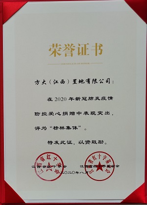 面对突如其来的新冠疫情,方大集团积极有序开展疫情防控工作的同时不忘承担社会责任。2020年1月30日,方大集团旗下方大置地(江西)有限公司向江西省红十字会捐款100万元用于疫情防控。抗疫至今,方大集团向红十字会捐款和为租户减免租金等金额超过550万元,并向社会捐赠5万只防护口罩。